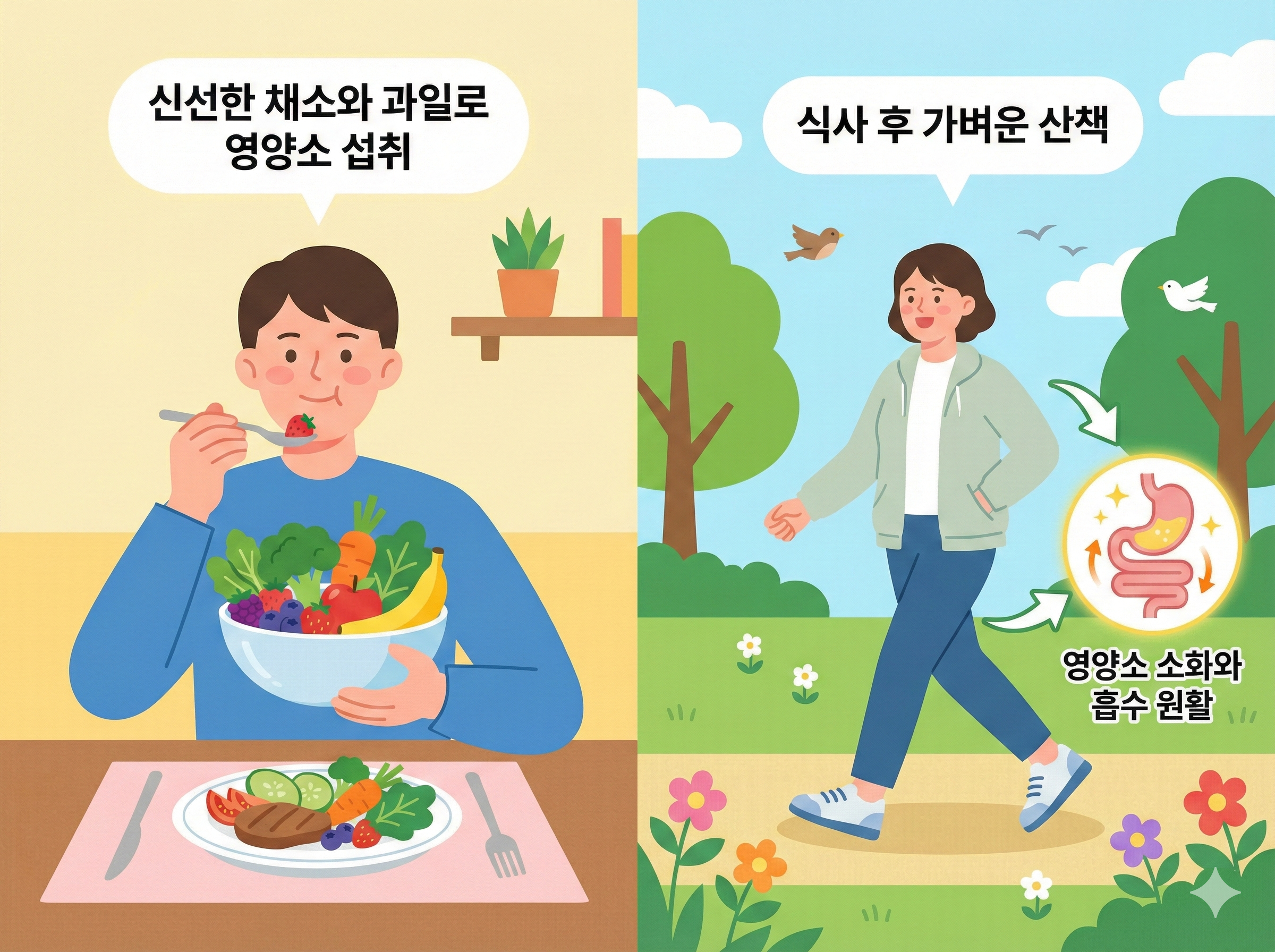 식사 후에 가벼운 산책을 곁들이면 영양소의 소화와 흡수가 더 원활해집니다.